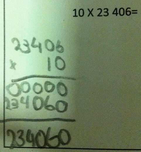 When students are asked to multiply or divide by a multiple of ten, you may see them ‘add’ zeros or ‘move’ the decimal point or jump to the algorithm. We need to scaffold students to see the link between place value and multiplication and division. Our place value system is a base 10 system. This means each column is related to the one adjacent to it by a factor of 10. That is, it is either 10 times larger or ten times smaller than its neighbouring column. Students need opportunities to realise that if we are multiplying or dividing by a place value unit (10,100,1000) we simply need to move the digits. In the example below we can see that it is overkill to use the algorithm, it is so much easier to increase the value of each digit by ten, thus moving each digit one place to the left. It is important to reiterate that we are NOT ‘adding’ a zero. We are in fact ‘placing’ or ‘putting’ a zero in the ones place to show that there are no ones when we complete the multiplication.